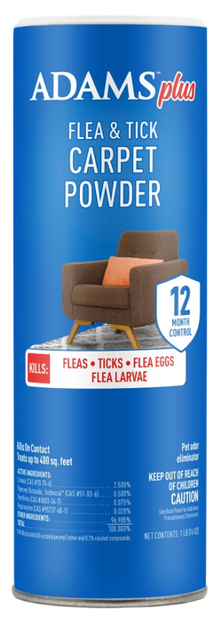 Protect your carpet from flea and tick infestations. Adams Carpet Powder with Linalool and Nylar works hard to kill fleas, flea eggs, flea larvae and ticks on carpets, rugs, and furniture where fleas may hide. This flea carpet treatment contains an Insect Growth regulator (IGR), Nylar, and the botanically-derived insecticide Linalool that kills all four stages of the flea life cycle: adults, eggs, larvae, and pupae. One 16 oz container can treat up to 400 square feet of a room, and you do not need to replace or reuse for one full year. It kills flea tick control for dogs. The flea killing carpet powder prevents flea re-infestation and controls the area for up to 365 days. Our carpet treatment deodorizes and freshens the home with a pleasant citrus fragrance while eliminating deep-down with this product of Adams for dog. To use, simply shake up the canister and evenly distribute across the carpet or fabrics and let it settle; for maximum efficacy delay vacuuming for 24 hours. With 5% of fleas living on your pet and the remaining 95% living in your home or yard, Adams products are designed to provide you with the power to prevent pests on every front.