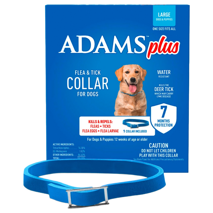 Adams Plus Flea & Tick Collar for Dogs kills fleas, flea eggs, flea larvae, ticks, tick larvae, and tick nymphs for up to 7months. The active ingredient specifically targets flea eggs and flea larvae stopping their ability to mature and infest your home. Adams Plus flea tick control for dogs is an odorless, non-greasy alternative to topical treatments that kills fleas and ticks and continues to protect against pre-adult fleas from changing into biting adults. Our one-size-fits-all large dogs and puppies flea and tick collar is adjustable to fit large dogs 12 weeks and older. This collar can also be worn with a regular collar. It is water-resistant and does not need to be removed if it gets wet. With 5% of fleas living on Adams for dogs and the remaining 95% living in your home or yard, it is important to also address the infestations that can be occurring in your home and yard. Adams products are designed to provide you with the power to prevent pests on every front. Try Adams Flea & Tick Home Spray, specifically designed to use inside your home, and Adams Yard & Garden Spray, designed to use outside in your yard.