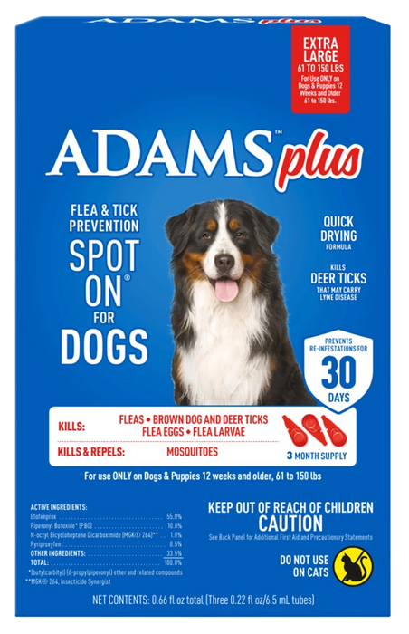 Adams Plus Flea & Tick 3 Month Supply Prevention Spot On for XL Dogs 61 to 150 lbs