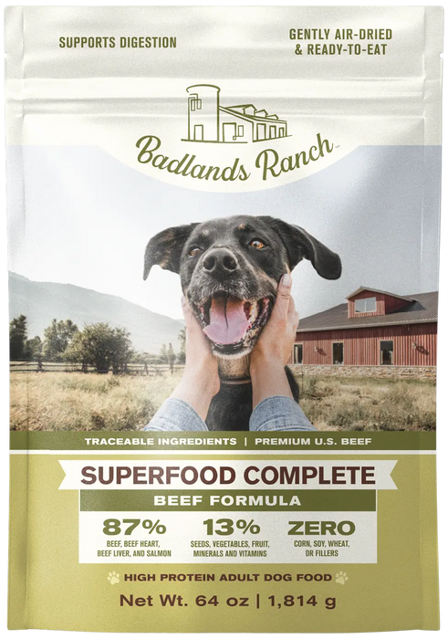 Badlands Ranch Superfood Complete Beef is a premium air-dried dog food designed to support whole-body canine health with real, nutrient-rich ingredients. Made of 87% premium beef, beef heart, beef liver, and salmon and 13% superfood-concentrated fruits, vegetables, and seeds, this blend promotes easy digestion, sustained energy, and immune function. Gently prepared under low-temperature cooking to preserve essential nutrients, it stands out as one of the best dry dog food options trusted by pet parents who want only the best for their furry companions.