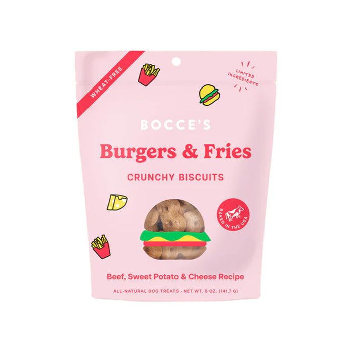 Bocce's Bakery Burgers & Fries Crunchy Biscuits Dog Treats Beef Sweet Potato & Cheese 5-oz