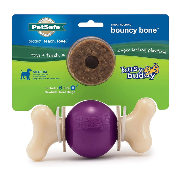Busy Buddy Bouncy Bone Treat-Dispensing Dog Chew Toy with Refillable Rawhide Treats Multicolor Medium