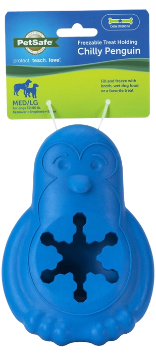 The Busy Buddy Chilly Penguin is a great way to keep your dog cool and entertained on a warm day. This unique Busy Buddy Dog Toy can be filled with your dog's favorite freezable treats, like yogurt or broth. Many owners feel it is one of the best dog toys for providing a long-lasting and refreshing challenge.
