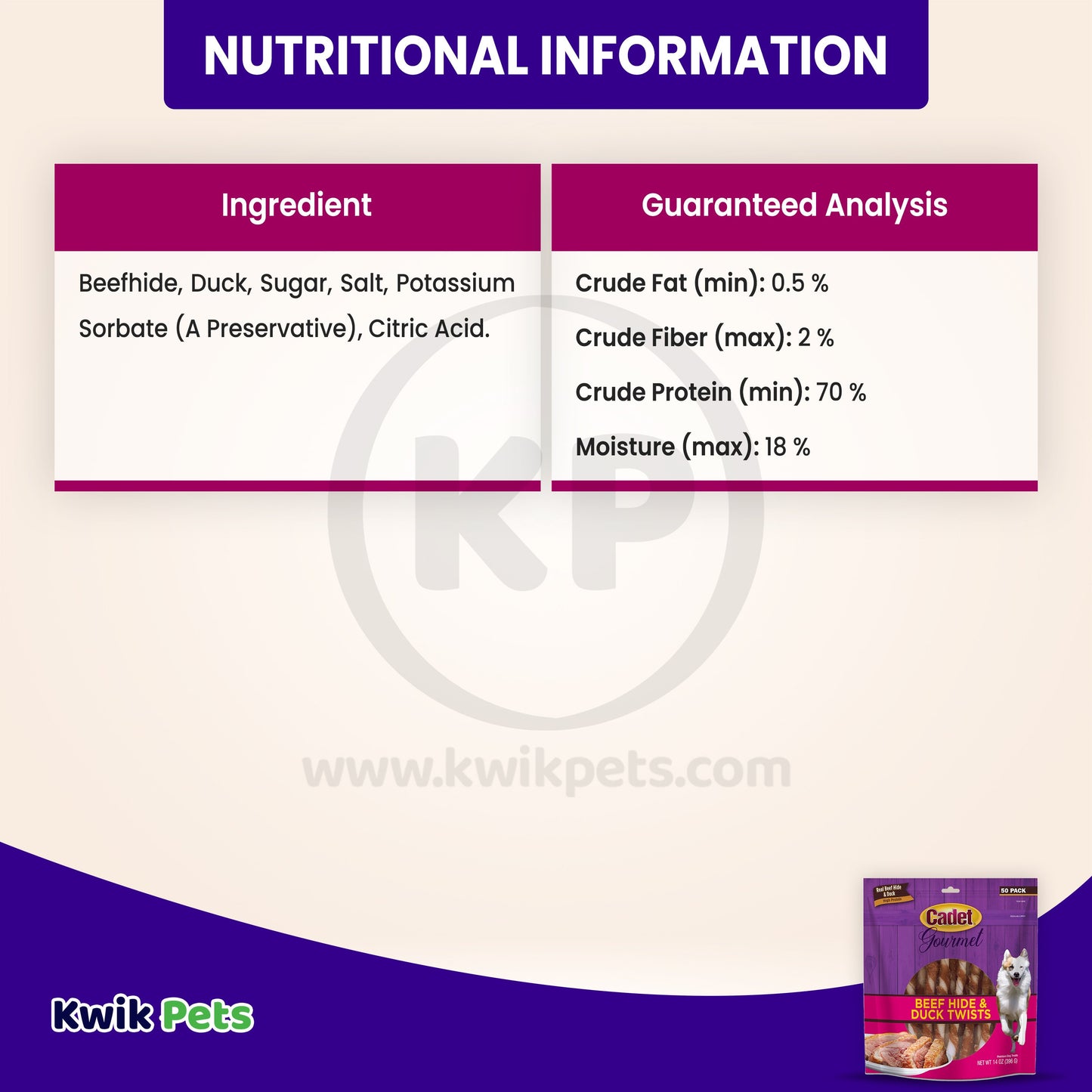 Introducing Cadet Gourmet Beef Hide & Duck Dog Twist Sticks, premium chews combining real duck wrapped around natural beef hide for ultimate canine enjoyment. These high-protein treats are made without artificial colors, fillers, or flavors, ensuring a wholesome snack. Cadet Duck Twists for Dogs provide a long-lasting chewing experience, satisfying natural instincts. As some of the best chew bones for dogs, it helps clean teeth and gums, supporting dental health. Inspected and tested in the USA, these treats meet high-quality standards for your pet's safety.