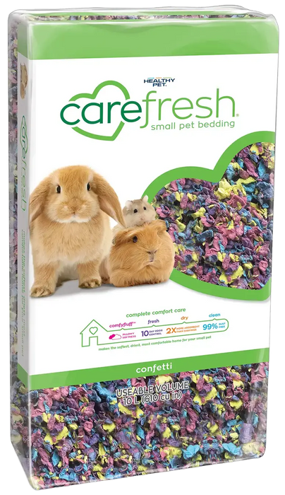 Carefresh Complete Comfort Confetti Paper Bedding offers a colorful and cozy home for small pets while ensuring superior cleanliness and comfort. This bedding for small animals creates a soft, cozy home where your pet can burrow, nest, and feel safe. Add a 2–6 inch layer depending on your pet and habitat size, giving them plenty of comfort and cushioning. Keep their space fresh by removing soiled spots daily and replacing the Carefresh Paper Bedding for Small Animals fully once a week after cleaning the habitat. Store the bedding in a cool, dry place so it stays fluffy and fresh, ready to give your little one the comfort they deserve.