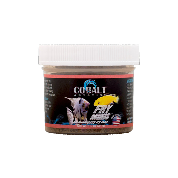 Additionally, Cobalt Fry Mini's are a complete high protein diet for the important first stages of a fry's life. (size ranges from .6mm-.8mm) Formulated with marine protein, vitamins, and minerals for proper body growth and development. Plus carotenoids for added color! Slow sinking pellets allow fish to feed at all levels in the aquarium.