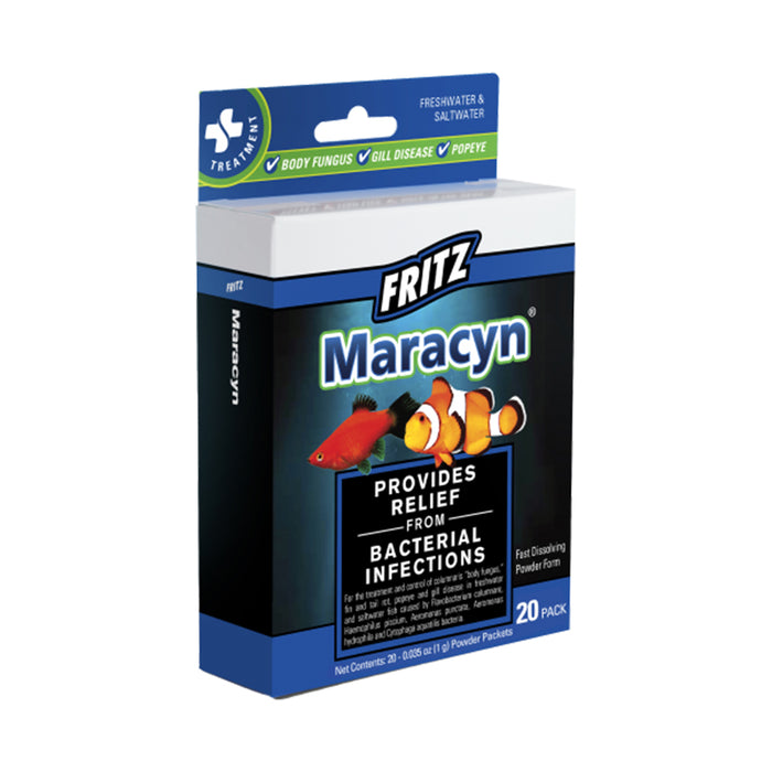 Fritz Maracyn is a broad spectrum antibiotic specially formulated for treating bacterial infections in both freshwater and saltwater aquariums. This essential aquarium fish supply effectively combats gram-positive pathogenic organisms responsible for disease such as body fungus (columnaris), fin and tail rot, popeye, and gill disease. Maracyn's unique formulation allows for complete yet gradual dissolution in water, ensuring thorough treatment of infected fish.