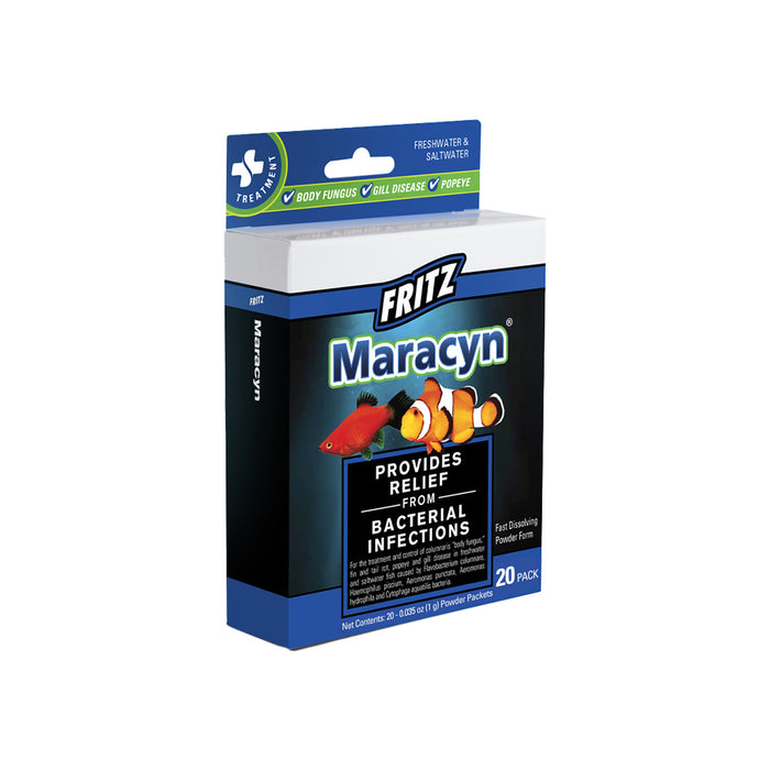 Fritz Maracyn Two is a powerful board-spectrum antibiotic designed to treat bacterial antibiotic infections in both freshwater and saltwater aquariums. This trusted aquarium supply effectively combats negative bacteria, which cause infections such as fin and tail rot, popeye, septicemia, dropsy, and internal bacterial diseases. Unlike external treatments, Fritz Maracyn Two is absorbed through the fish’s skin, ensuring deep, systemic relief. It's a great first-choice treatment when the cause of illness is uncertain and can be safely used alongside other Fritz medications like Maracyn and Coppersafe.