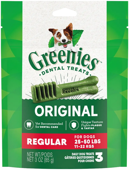 GREENIES Original Dental Treats Regular is specially formulated for medium dogs. These treats help clean teeth and control bad breath. Greenies Original keeps the mouth clean and gums healthy. When given daily, the chewy texture controls the formation of plaque and tartar. Further, Greenies Original prevents periodontal diseases in medium dogs. These vet-recommended dog dental treats provide overall dental care for dogs.