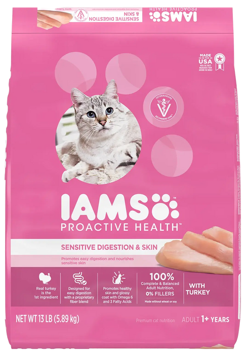 - Bag Of IAMS Proactive Health Adult Sensitive Digestion & Skin Dry Cat Food Kibble With Turkey.