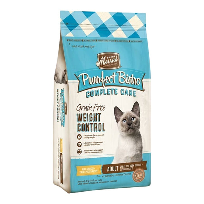 Merrick Purrfect Bistro Complete Care Weight Control Dry Cat Food, Real Chicken and Sweet Potato Recipe. Premium Grain Free Weight Management Cat Food For Adult Cats Real deboned chicken is the first ingredient in this weight management cat food. This is a healthy, high protein adult cat food that helps your cat maintain lean muscle mass This premium cat kibble is crafted with L-carnitine for metabolism support, antioxidants for immune system support, and is natural with added vitamins, minerals, and nutrients like taurine