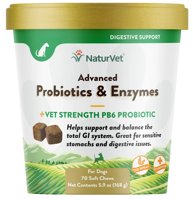 NaturVet Advanced Probiotics and Enzymes Soft Chews are veterinarian-formulated for use in dogs over the age of 6 weeks. These Soft Chews for Dogs utilize PB6 technology, which allows beneficial bacteria to travel through the entire GI tract, ensuring optimal stomach and intestinal balance. They contain a source of live, naturally occurring microorganisms that promote a healthy digestive system.