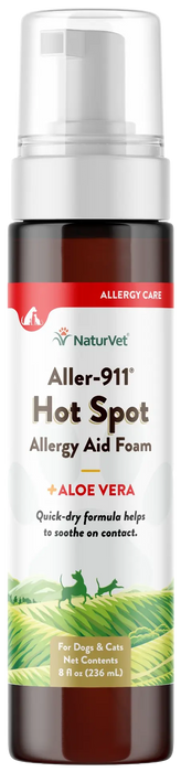 NaturVet Aller-911 Hot Spot Foam with Aloe Vera is specially made for dogs and cats. The foam spray quickly relieves itchy, irritated skin, while the bittering agent helps deter gnawing and chewing. The quiet foam application is ideal for pets sensitive to sprayer noise. This gentle, quick-drying formula eliminates the need for ointments and gels. NaturVet Aller-911 Hot Spot Foam can be used with spot-on flea products.