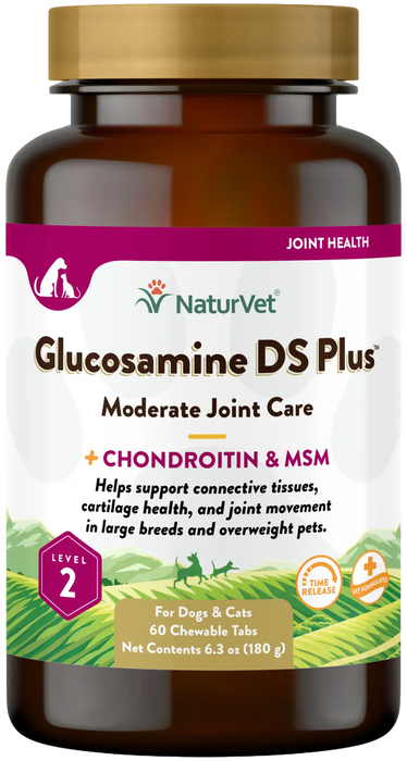 NaturVet Glucosamine-DS Plus Level 2 Moderate Care veterinarians formulate Time Release Tablets. These NaturVet chewable tablets offer a natural, effective solution for promoting joint health without artificial colors, flavors, or preservatives. They are designed to enhance quality of life by supporting an active lifestyle and alleviating discomfort associated with daily exercise. The convenient, tasty tablets make daily administration easy, encouraging consistent use for optimal joint care and maintenance.
