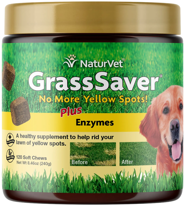 NaturVet GrassSaver Soft Chews for Dogs are healthy soft chews made for dogs to prevent yellow spots on lawns. These veterinarian-formulated treats are designed to help diminish yellow spots on green grass. NaturVet GrassSaver helps get rid of yellow spots by maintaining normal urine pH levels in dogs. These dog chewy treats also help maintain urinary tract health and support kidney health.