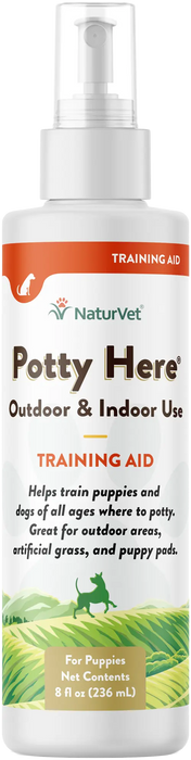 NaturVet Potty Here Training Aid Spray contains water and other carefully selected ingredients. Its specialized attractant is key to drawing dogs to eliminate in the desired location. Whether you're training a puppy or a senior dog, this spray is a valuable aid for improving NaturVet dog training behaviour techniques.