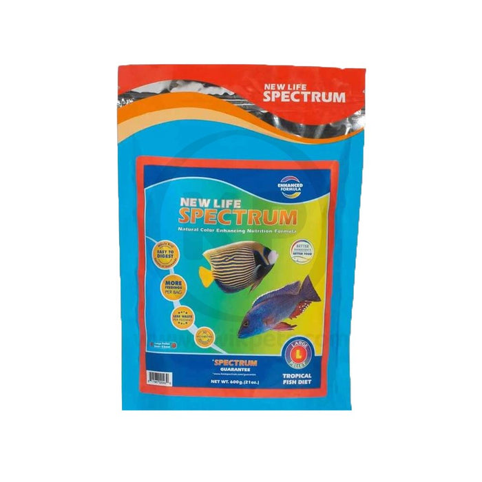 New Life Spectrum Color Enhancing Tropical Fish Food large size is for Fresh & Salt Water Fish. This comes in a 600g container with 3mm pellets. This balanced diet of large-sized formula fish food is thoughtfully crafted to provide a nutritious and color-enhancing diet for your aquatic companions. It is the Best Fish food that enhances the natural colors of your tropical fish, promoting vibrant and stunning hues.