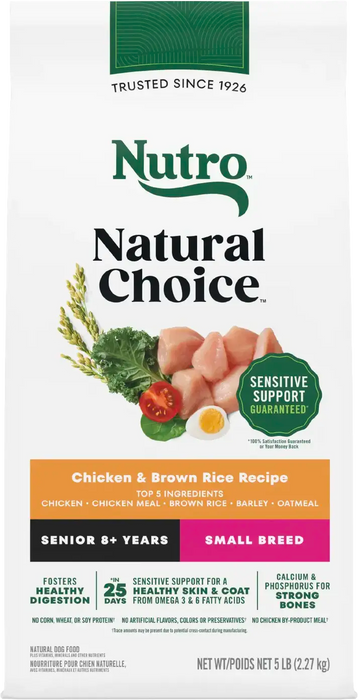 Give your pet the wholesome ingredients they love with NUTRO NATURAL CHOICE Dry Dog Food recipes. Made for small breed senior dogs ages 8 years and older, this dry food helps support your mature dog’s aging immune system with essential antioxidants. It provides calcium to help support strong bones and joints, and it provides natural fiber for healthy digestion. As part of the NUTRO FEED CLEAN philosophy, this delicious chicken and brown rice recipe starts with a high-quality protein source as the 1st ingredient and is made with real, recognizable ingredients sourced from trusted farmers and suppliers.