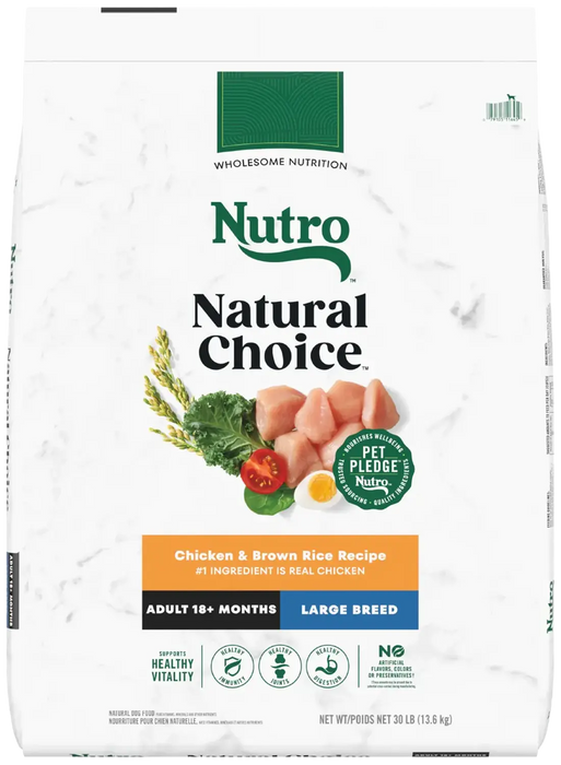 This Nutro Dry Dog Food is made just for big adult dogs. It gives them all the important food they need to stay healthy and happy. Real chicken is the first thing in it. This special dry dog food helps keep their joints strong, their skin and fur healthy, their tummy working well, and their body strong against sickness.