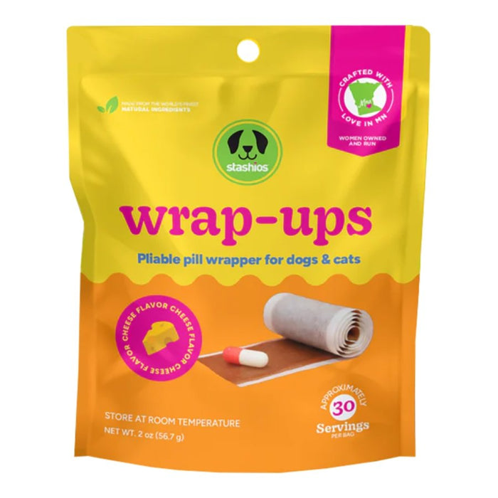 STASHIOS: WRAP-UPS CHEESE PILL WRAPPER FOR DOGS & CATS - 30 Servings Bag - Disguise your buddy’s medicine with delicious Stashios Wrap-Ups Cheese Flavor Grain-Free Dog & Cat Treats. These sneaky wraps stretch to cover your fur-iend’s pill, tablet or capsule in a yummy cheese flavor he’ll love. Simply tear off the size you need, wrap it around the pill, seal it tight and serve it to your fur-iend—he’ll think it’s a tasty treat! Even better, Wrap-ups are full of vitamins, minerals and fiber for immune support and overall health. Stashios is women owned and run in Minnesota! Gluten-free. Free from fillers like corn, wheat and soy, so they even suit sensitive sidekicks. Easy-to-use pill wrapper is made in the USA. Stashios® is a women owned and run company offering products that stash what pets need in what they love. We are inspired by pets, fueled by fun, and committed to health and wellness. We help you care for your pets by creating products that encourage them to learn, play and be well. If you’re like us, you believe a full life includes an awesome dog.